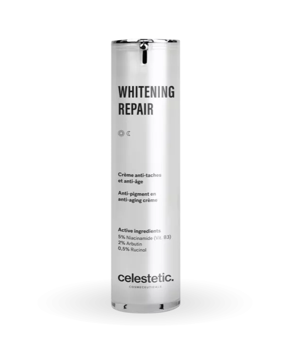 De Celestetic Whitening-range is ontworpen voor alle huidtypen die kampen met pigmentvlekken, zonneschade, post-inflammatoire hyperpigmentatie of een onegale huidtoon. Melaninepigmentatie is het resultaat van een overactief melanogenese-proces waarbij melanocyten te veel melanine aanmaken als reactie op UV-straling, ontsteking of hormonale schommelingen. De Whitening-range blokkeert dit proces op meerdere niveaus tegelijk: via vitamine C (remming van tyrosinase), niacinamide (remming van melanosoom-transfer naar keratinocyten) en exfoliatie (versnelde afvoer van gepigmenteerde corneocyten).