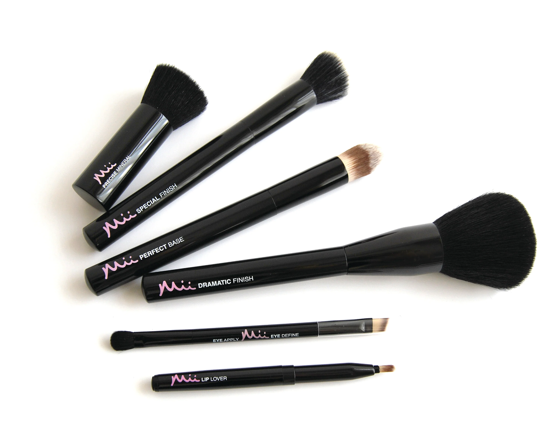 Een complete Mii kwastencollectie voor een volledige dagelijkse make-uproutine bestaat uit vijf instrumenten die elk een specifieke stap bedienen.