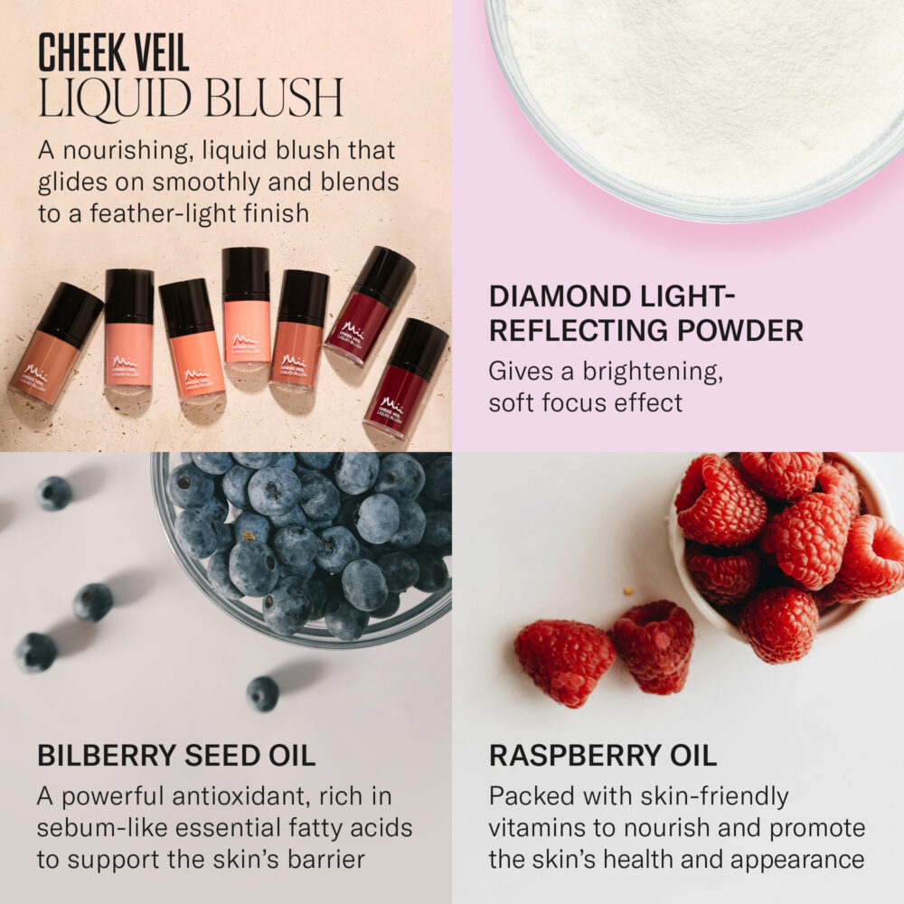 Mii Cheek Veil Liquid Blush donne à vos joues un blush frais et naturel avec une formule légère et accumulable et un applicateur précis. Éclat garanti !