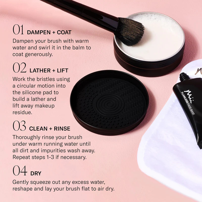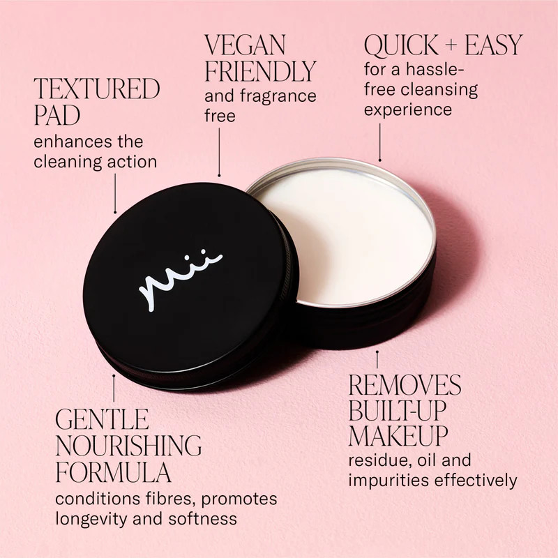 Le Mii Cleanse & Care Brush Balm est un baume nettoyant doux pour la peau et inodore spécialement conçu pour les pinceaux et les outils de maquillage.