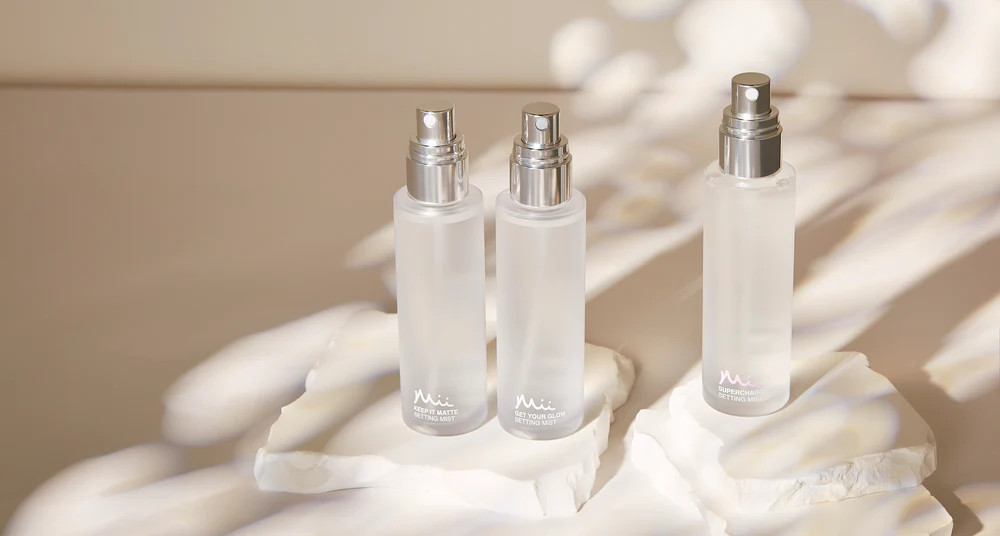 Mii Get Your Glow Setting Mist ist ein feuchtigkeitsspendendes 2-in-1-Spray mit Granatapfel und Goji, das das Make-up fixiert und Ihre Haut mit einem gesunden Glanz zum Strahlen bringt - ideal für trockene oder stumpfe Haut.