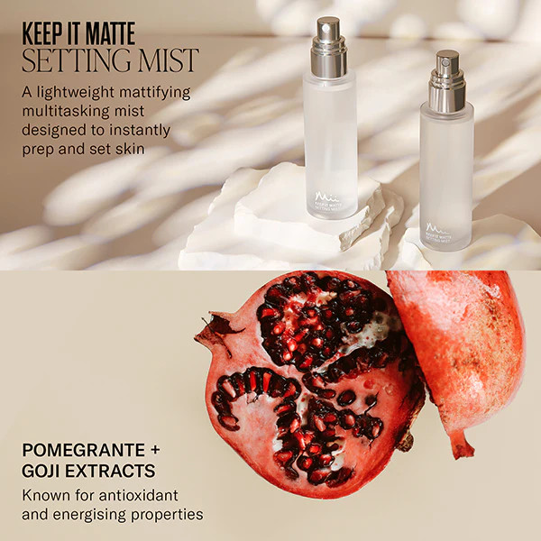 Mii Keep It Matte Setting Mist : fixe le maquillage, réduit la brillance et garde votre peau fraîche et mate jusqu'à 16 heures. Formule sans huile, légère et confortable.