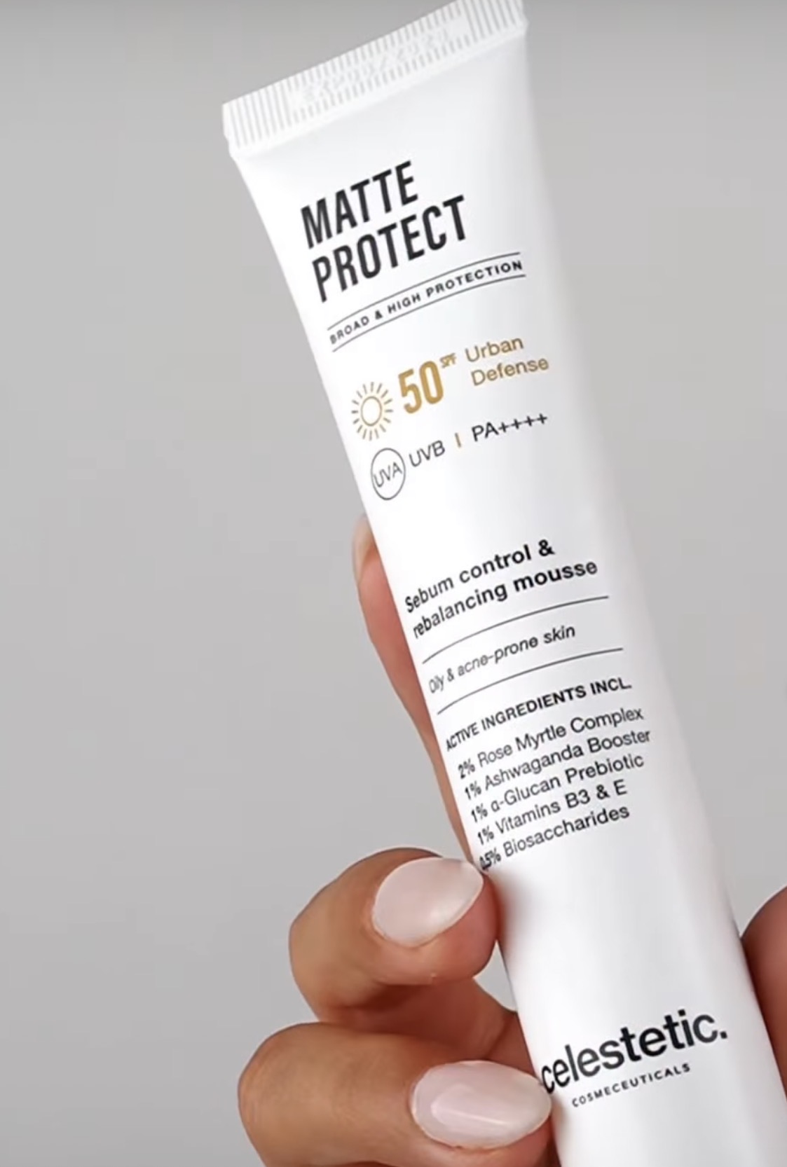 Celestetic Matte Protect SPF 50 - mousse solaire légère avec une protection élevée et une finition mate. Parfait pour les peaux grasses ou mixtes.