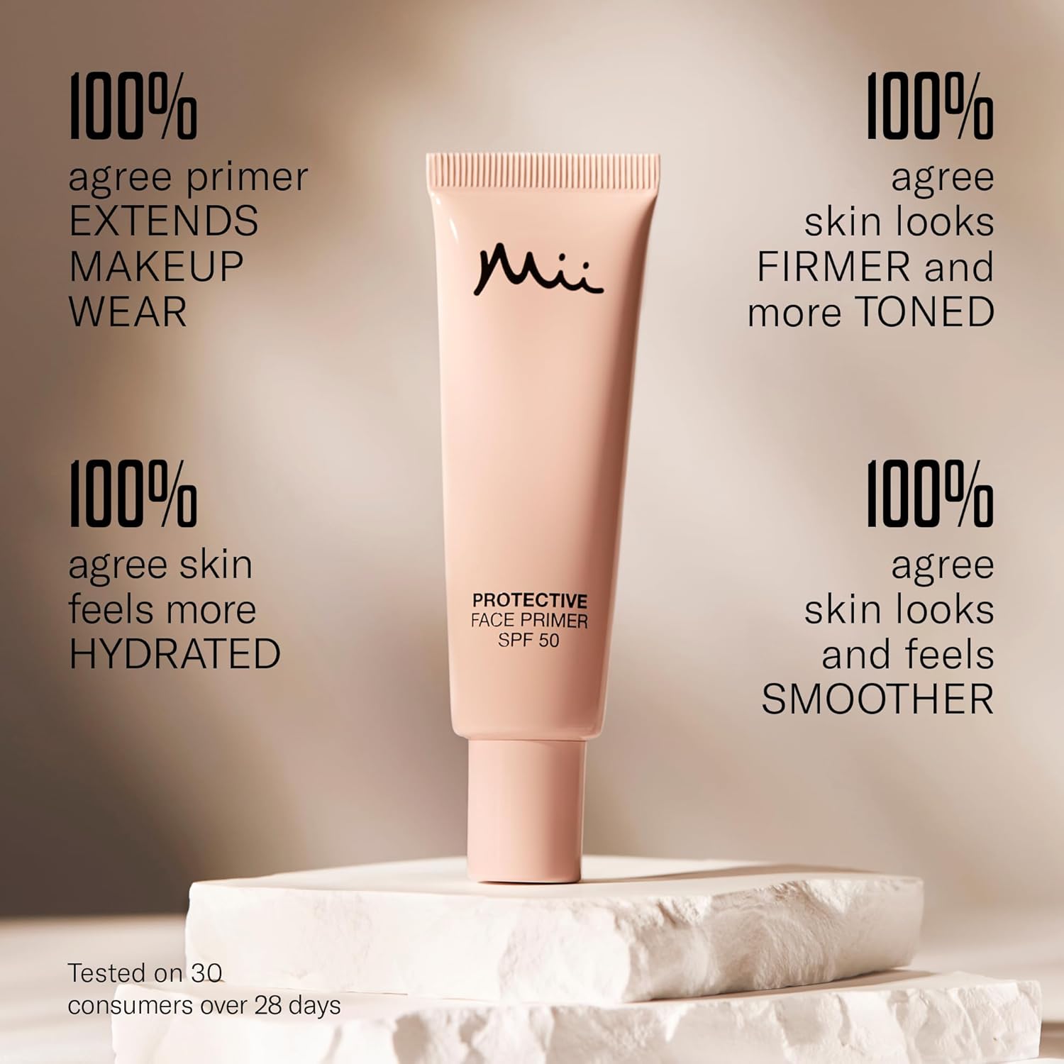 Apprêt hydratant avec SPF 50 de Mii. Protège, adoucit et prolonge le maquillage. Parfait pour les peaux sèches, sensibles ou matures.