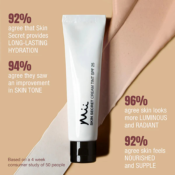 Mii Skin Secret Cream Tint SPF 25 soigne, hydrate et protège avec 4 teintes qui s'adaptent à votre teint - pour un look lumineux et naturel.